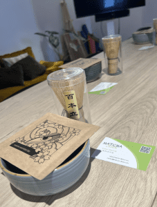 Pour rendre cette initiation encore plus spéciale, j’avais préparé un petit kit pour chaque participant : un chasen (le fouet traditionnel en bambou), un chawan (le bol à matcha), et un échantillon de thé Matcha Kumiko, que j’apprécie particulièrement pour sa finesse et sa douceur. L’idée, c’était qu’ils repartent avec tout ce qu’il faut pour reproduire l’expérience chez eux.